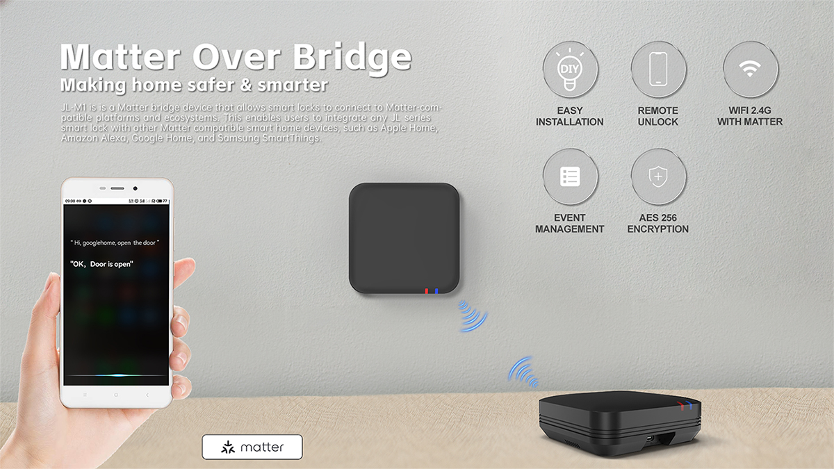JL-M1 is a Matter Bridge device that allows smart locks and sensors to connect to Matter –compatible platforms and ecosystems. This enables users to integrate any JSW series lock and sensors with other Matter compatible smart home devices, such as Apple home, Amazon Alexa, Google Home, and Samsung Smart Things.